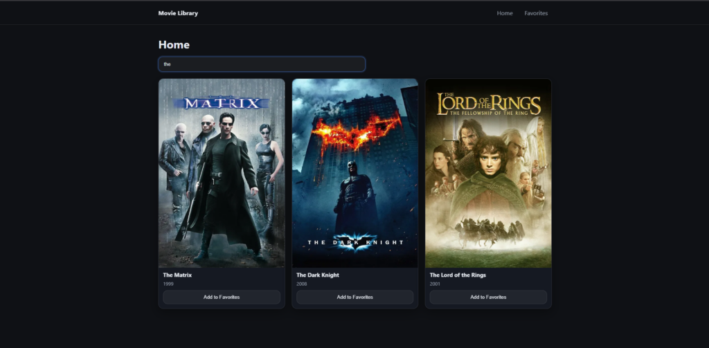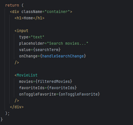 - Komponente (App, Home, Favorites, MovieList, MovieCard)